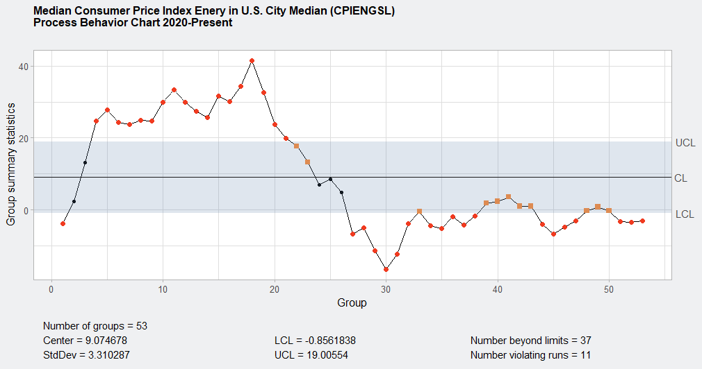The three XmR charts reveal different behaviors in inflation dynamics across core, energy, and utility categories since 2020. Process Behavior Charts are uniquely valuable for distinguishing between common cause and special cause variation, which is essential in identifying structural changes, temporary spikes, or shifts in economic conditions.