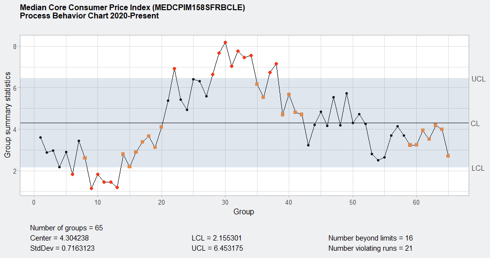 The chart for median core CPI displays a stable process in early 2020, followed by a pronounced rise starting mid-2021. A significant number of points exceed the upper control limit (UCL), especially during the sharp upward trend in 2021–2022, indicating special cause variation and confirming a fundamental change in the inflation process for core goods and services.